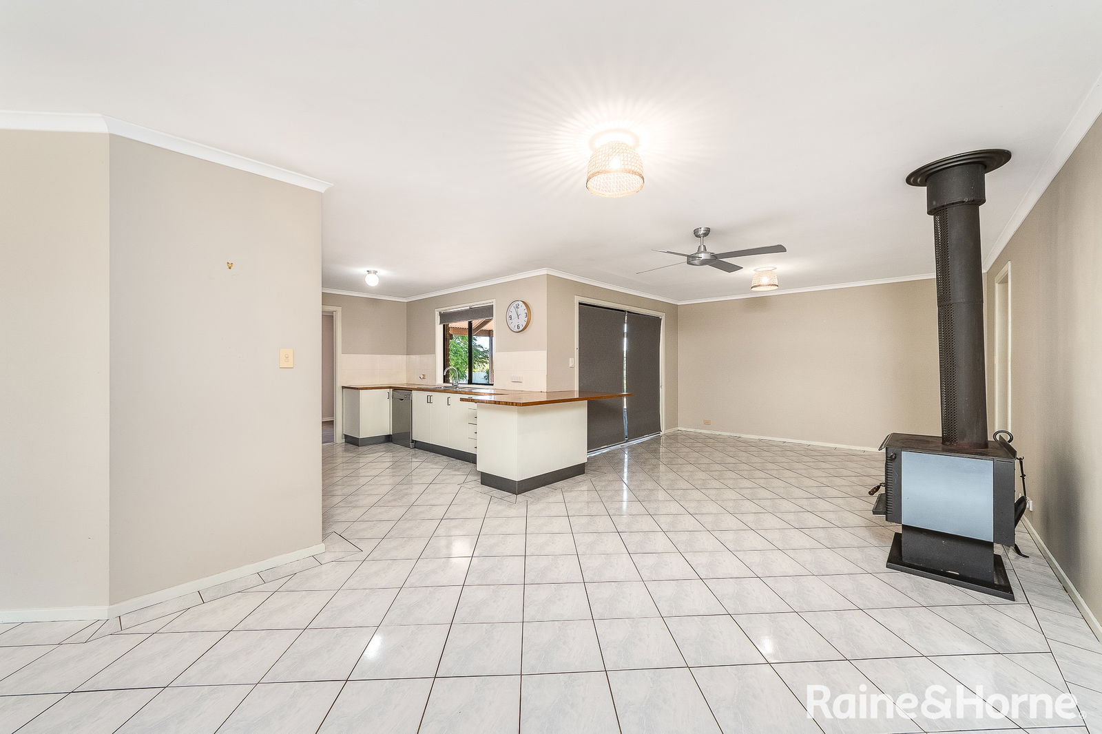 – Huge tiled family room with slow combustion heater, ceiling fan and sliding doors to large paved pergola