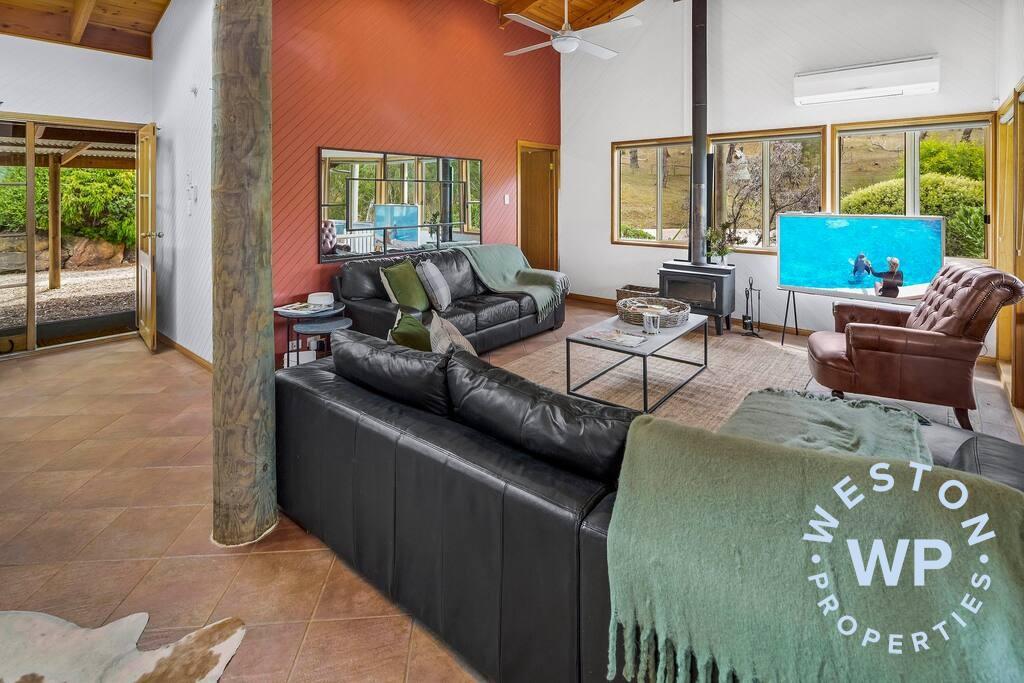 * Open plan dining room and living room with a slow combustion and split system air conditioner.