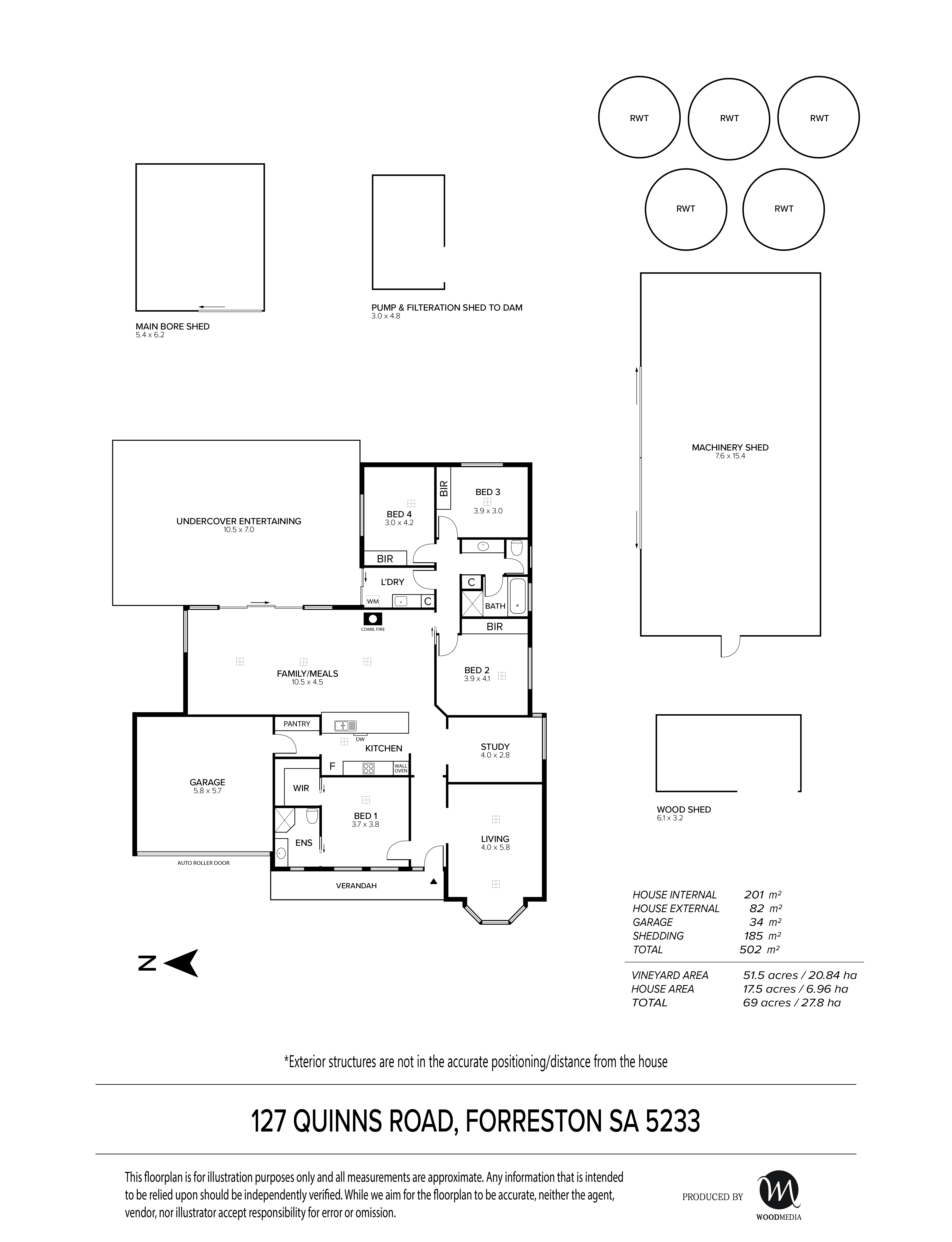 The implement/wood storage shed is nearby and the modern 45′ x 30′ farm shed together with 3 phase power. Approximately 100,000 litres of rainwater storage is provided from five interconnected tanks.